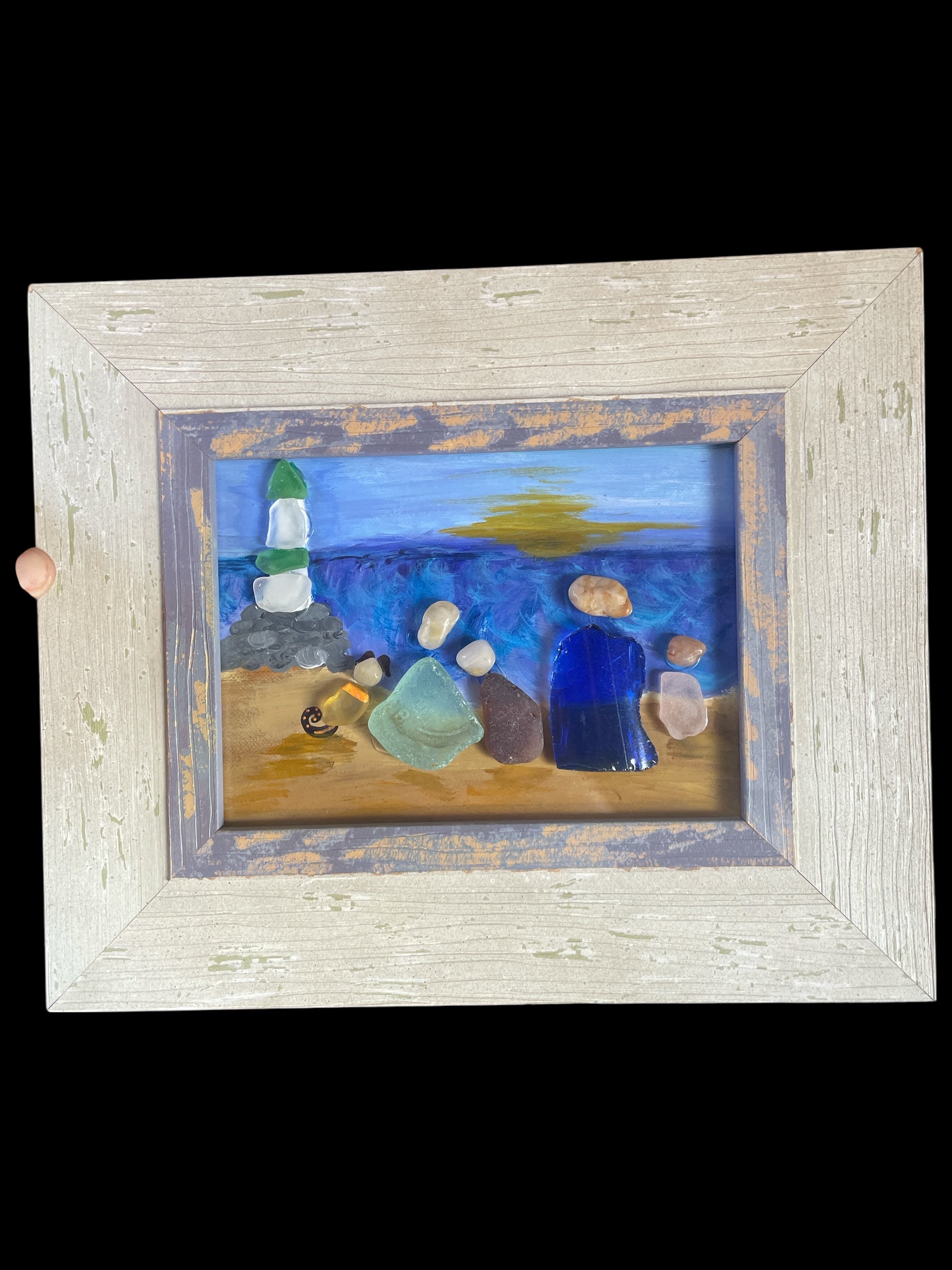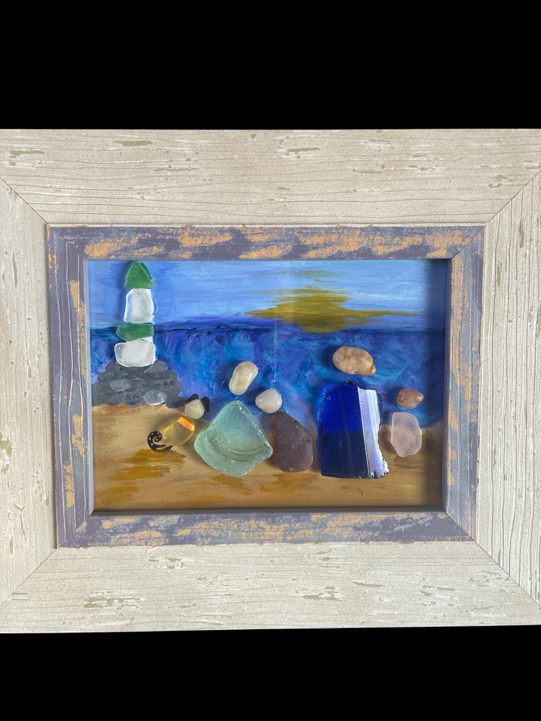 A hand-painted beach scene of a family (and adorable pup) watching the sunset near a lighthouse. A reminder to breathe deep and appreciate life's little moments. All beach glass and pebbles are from Lake Erie.