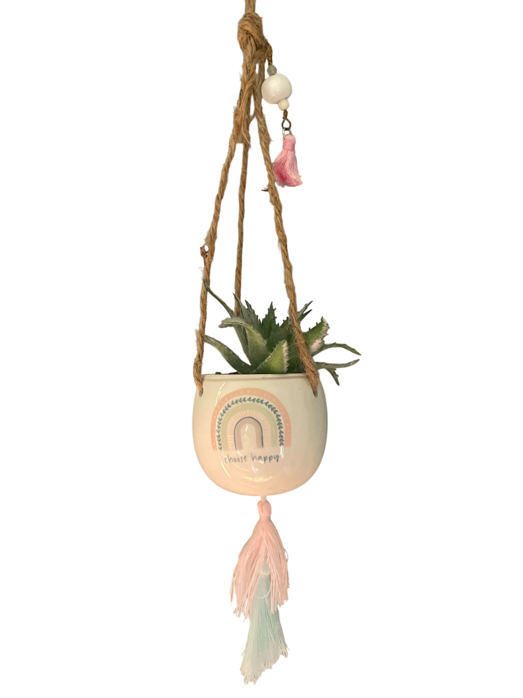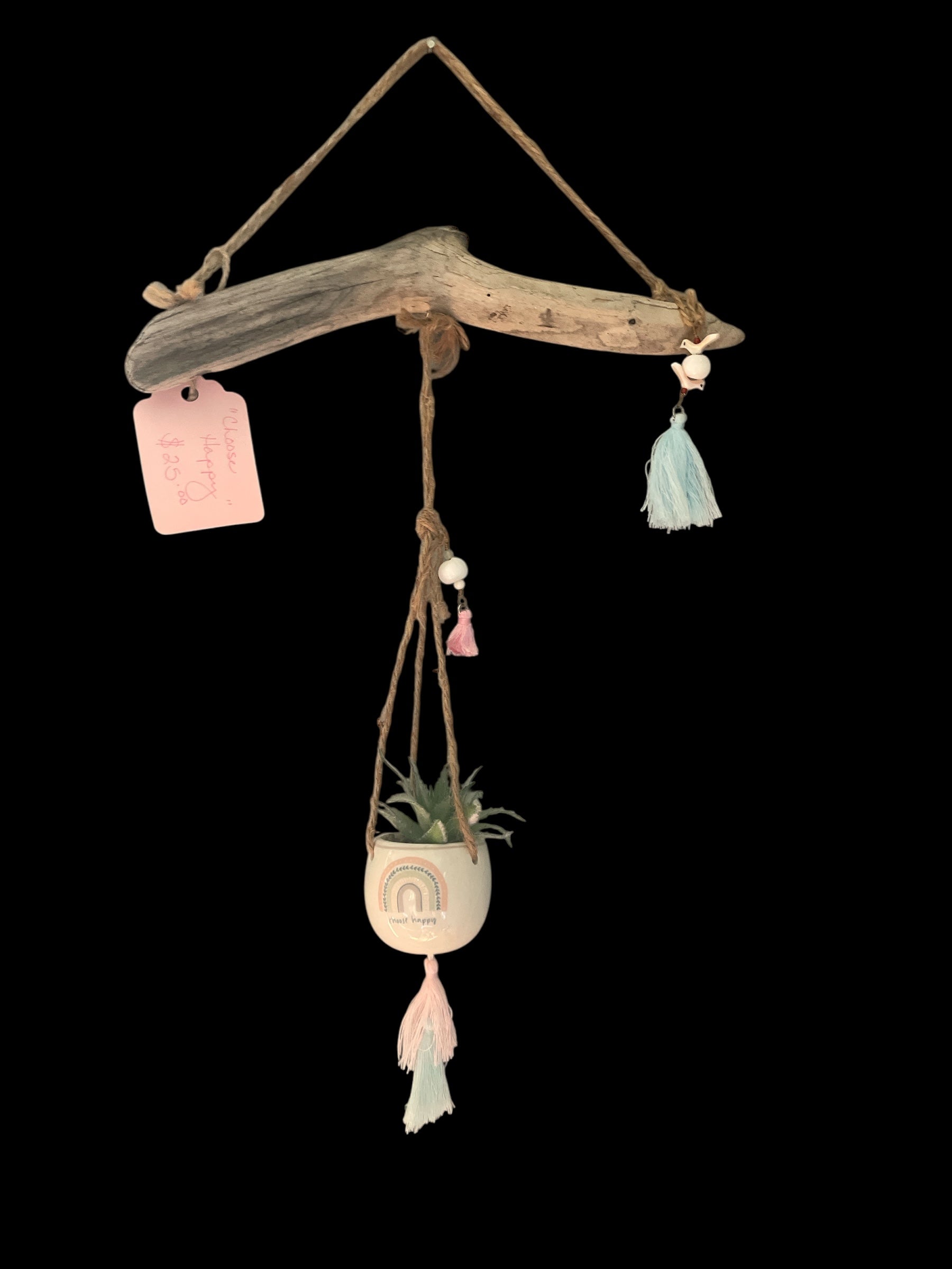 Lake Erie driftwood. A sweet ceramic pot with a rainbow and the statement "Choose Happy." A faux succulent that you cannot kill. Tassels and bird beads complete the piece.