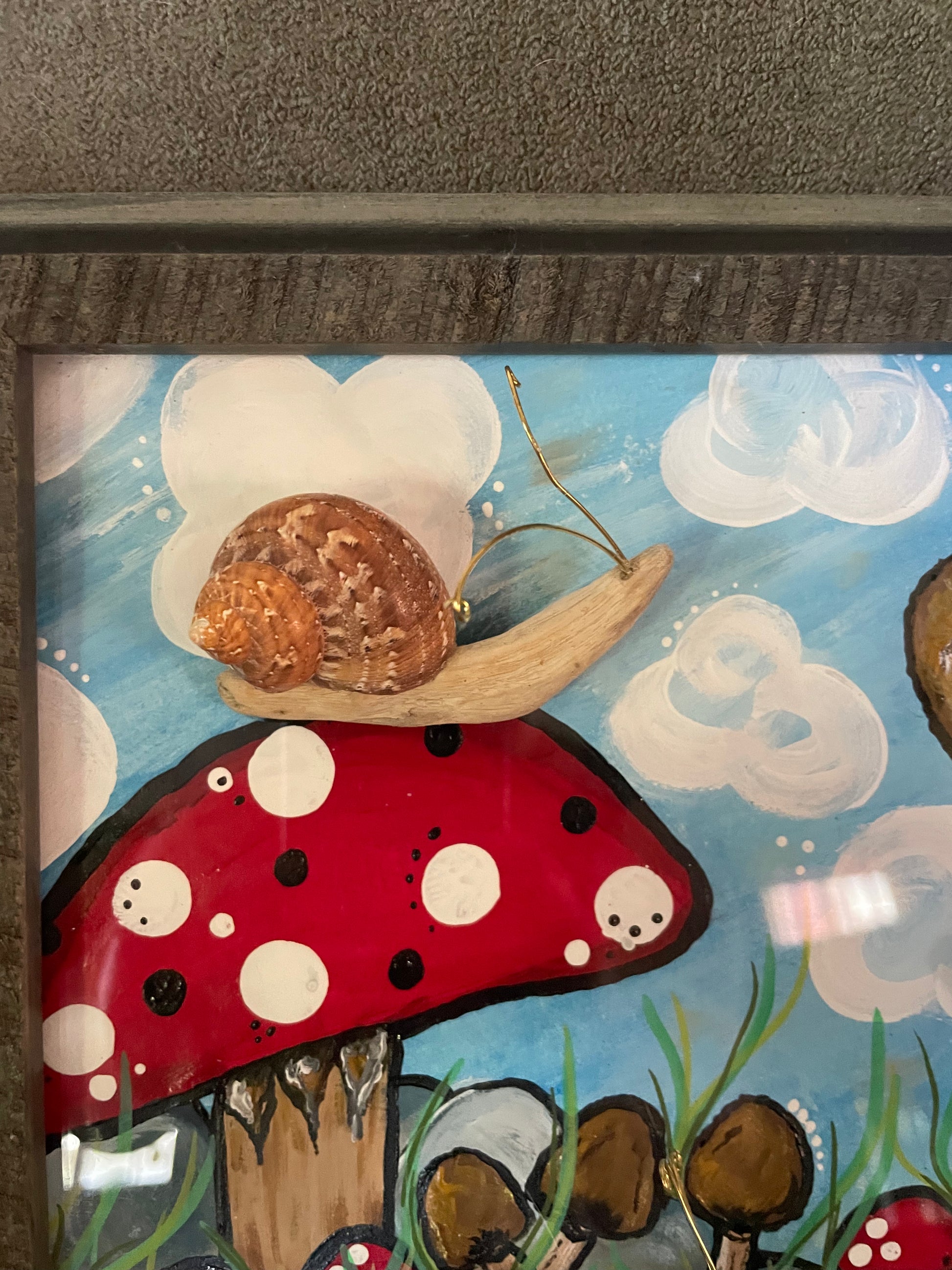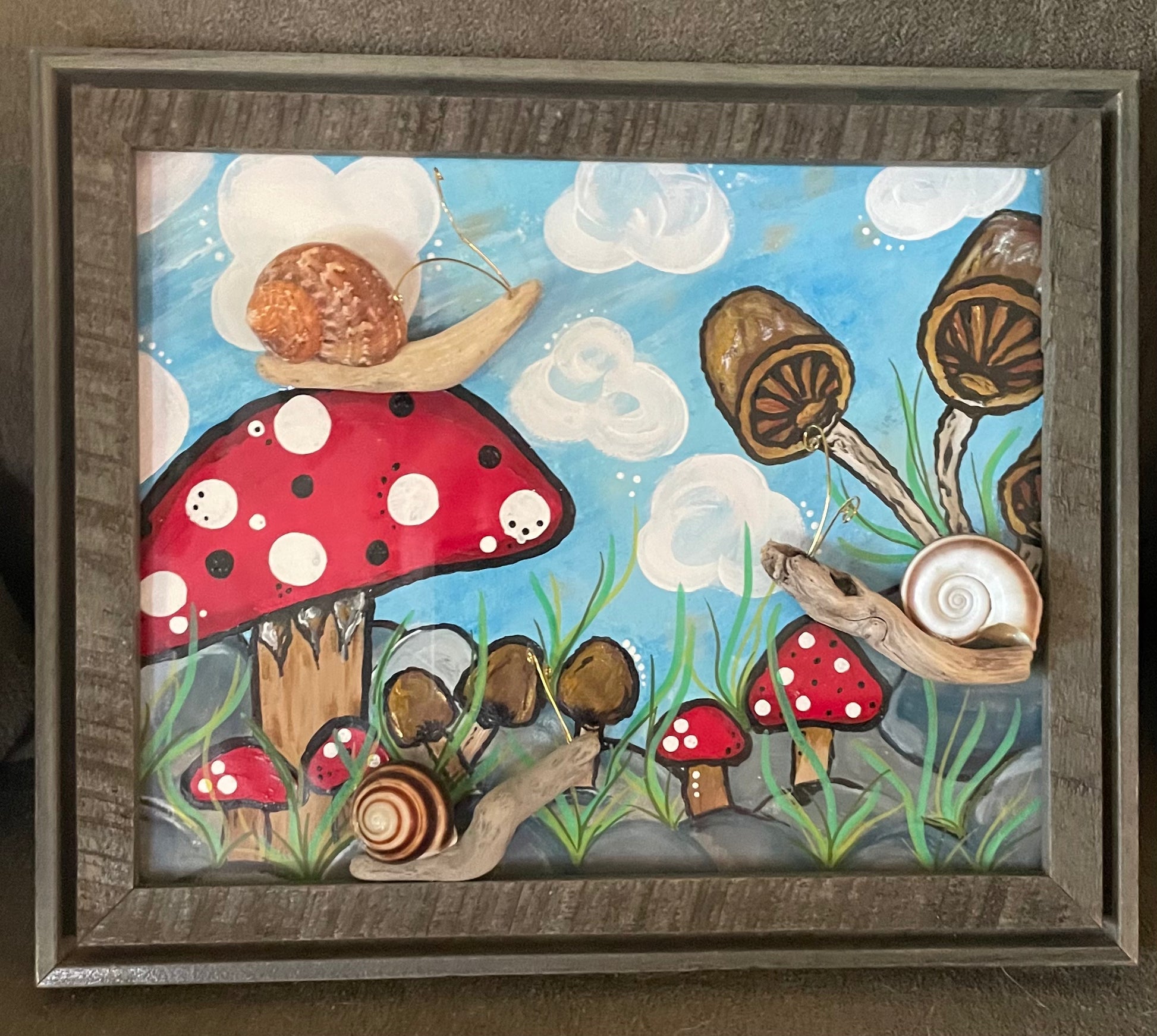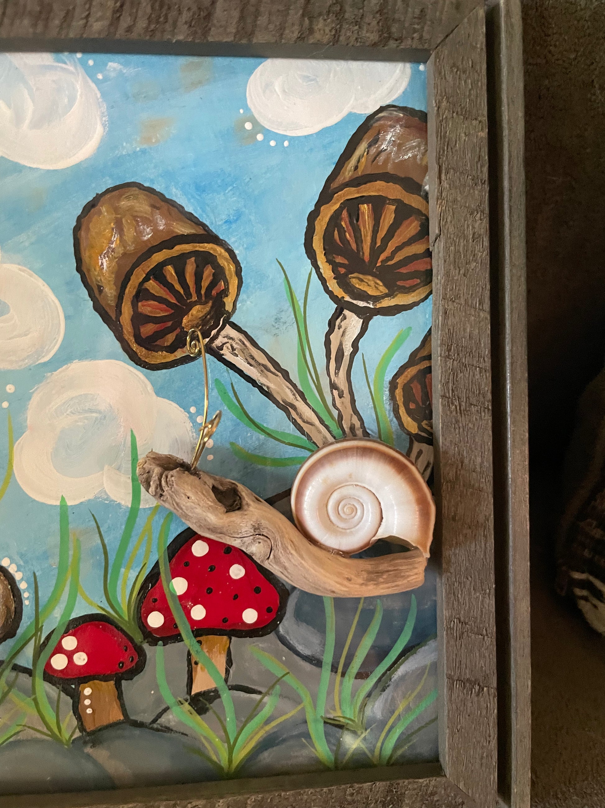 3 whimsical little snails- made of Lake Erie driftwood and seashells- climb within a magical land. Hand painted background features fantasy and shrooms- what's better?
