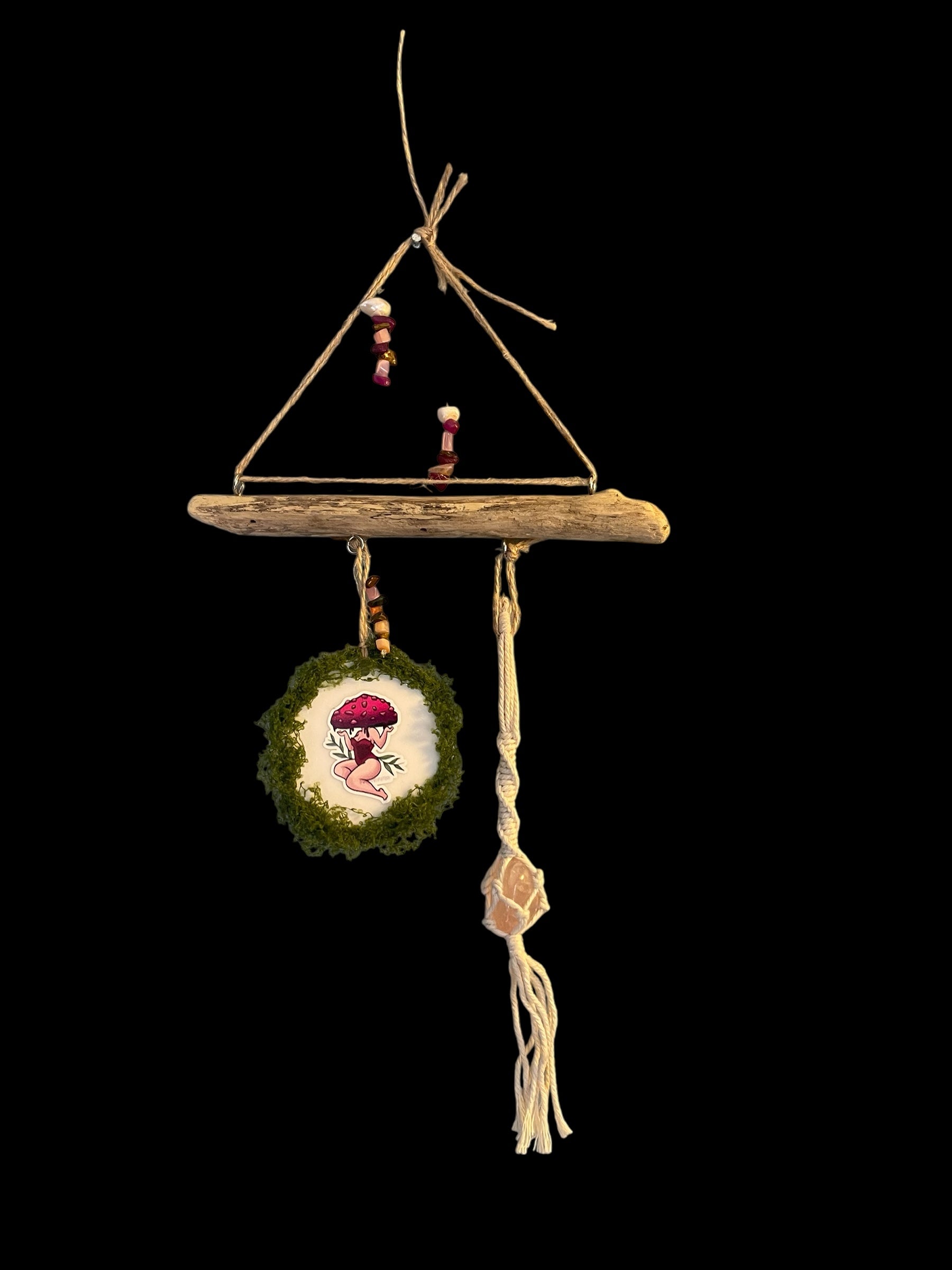A sassy mushroom headed lady on a ceramic disk surrounded by faux moss.