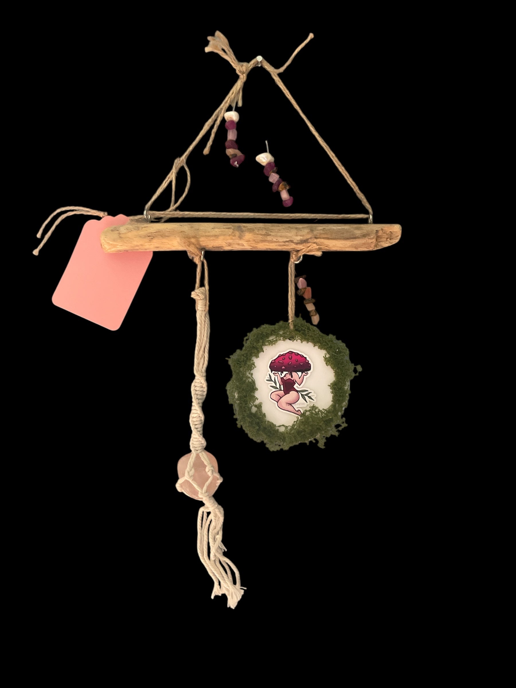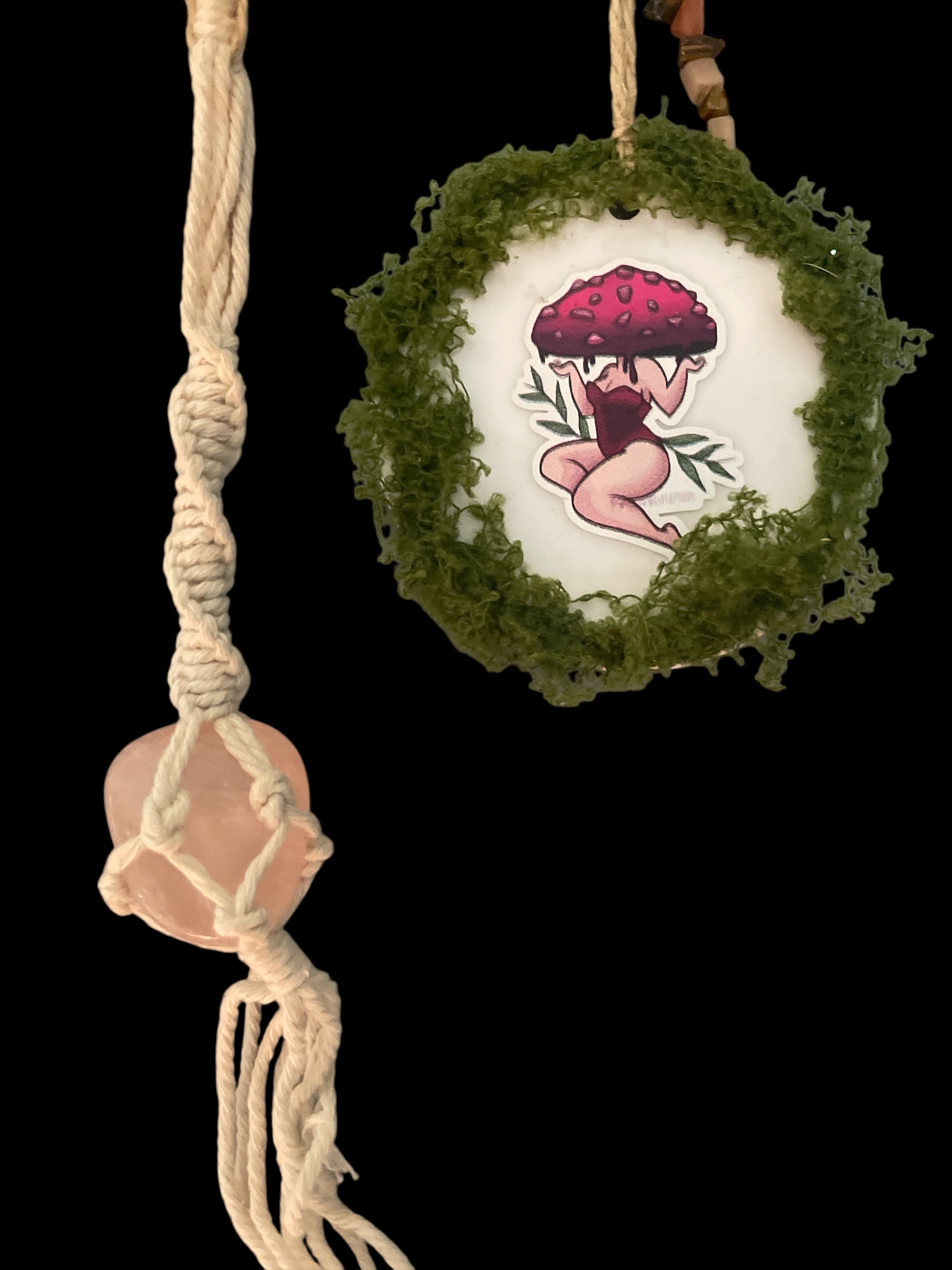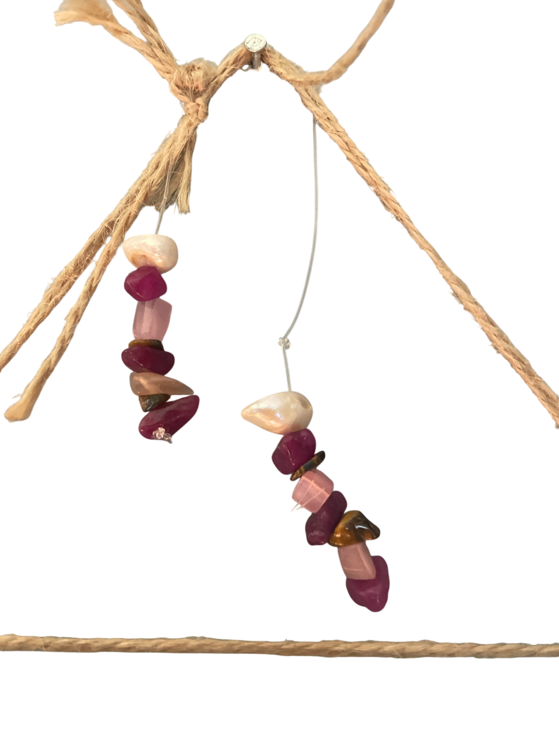 A rose quartz safely suspended in macrame.