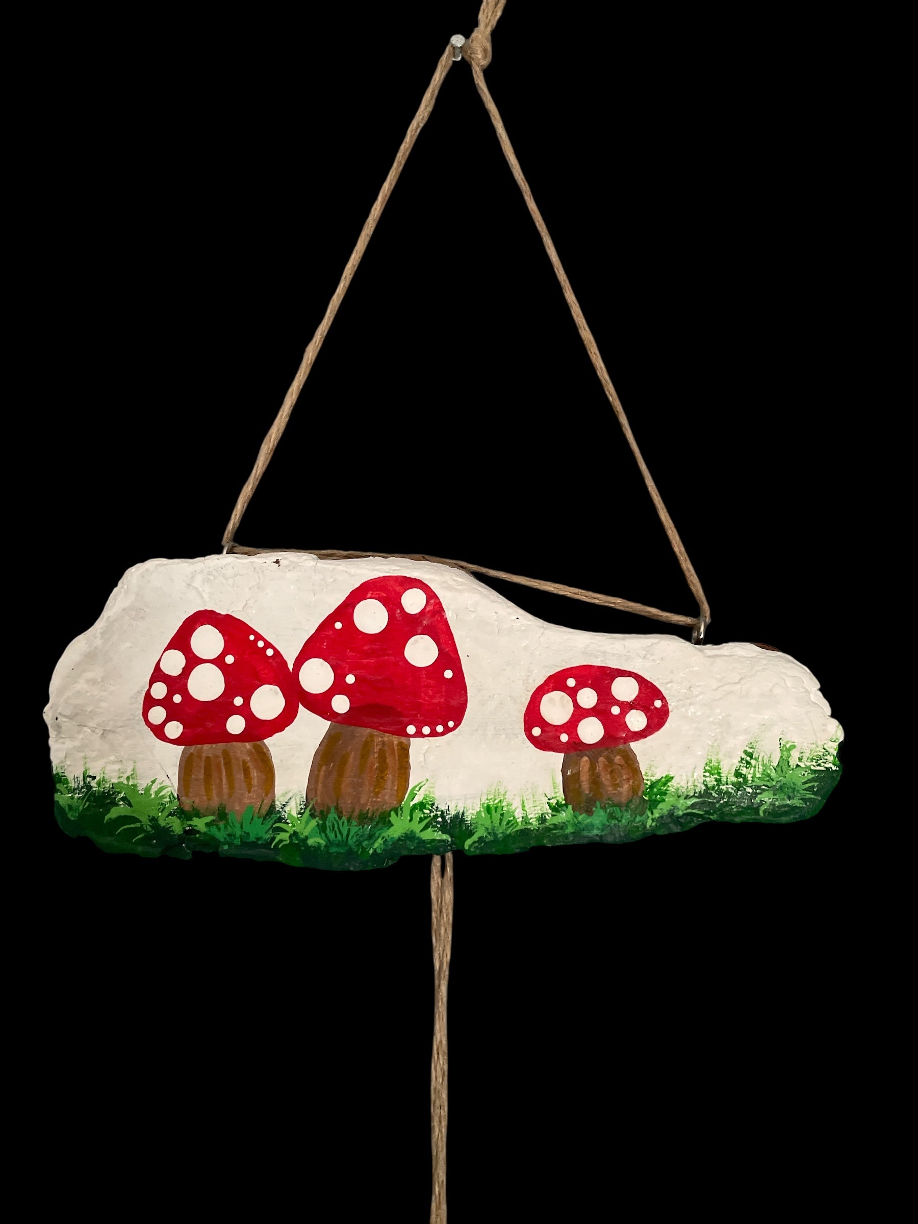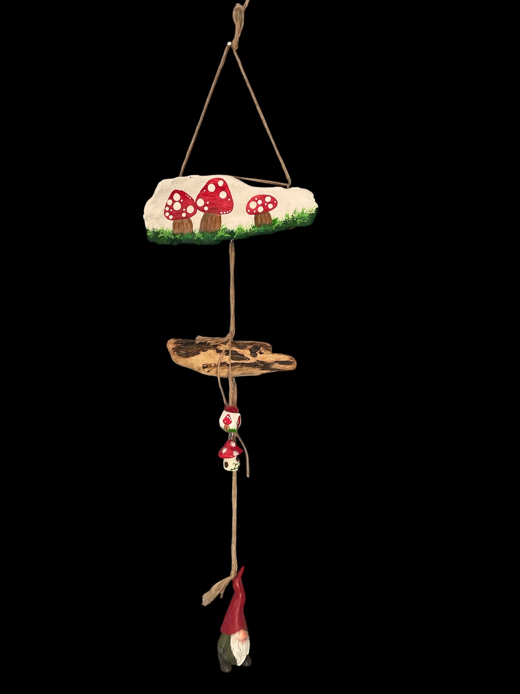 Hand-painted mushrooms on Lake Erie driftwood. A hand-painted bead attached to a sweet little mushroom house. And, of course, a gnome for good measure.
