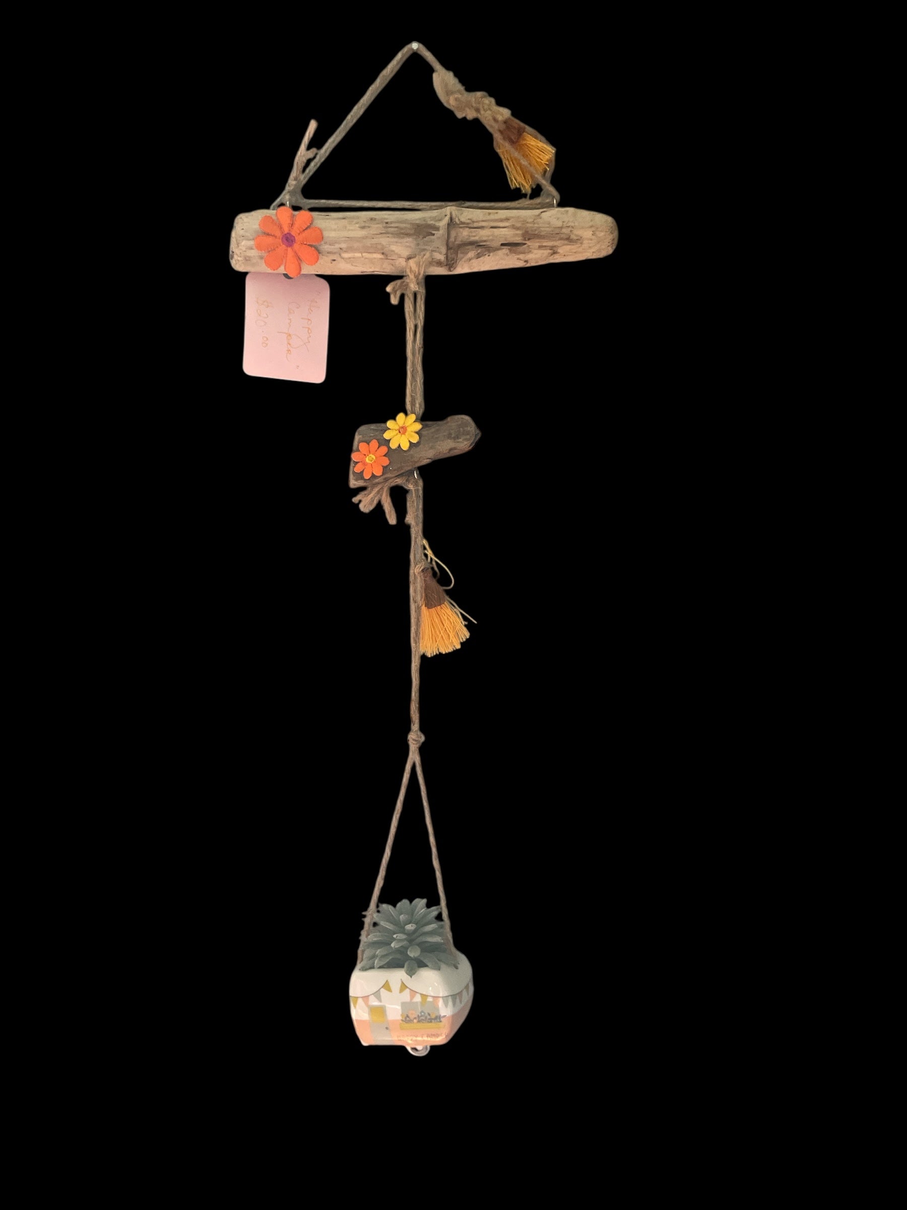 Perfect for the awning of your RV! Lake Erie driftwood supports a faux succulent in a ceramic RV, embroidered flowers and tassels with one very true message: Happy Camper