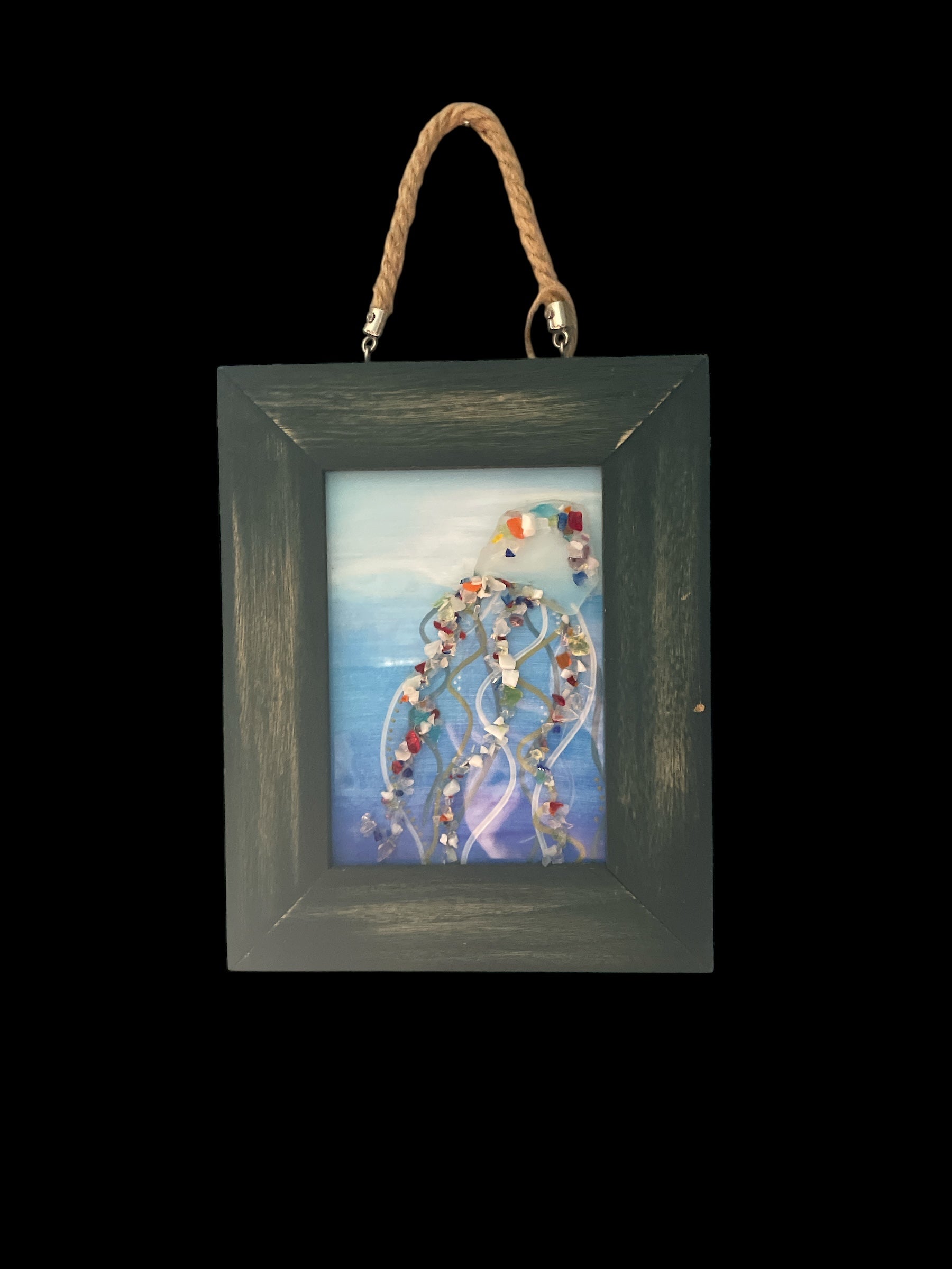 A large piece of Lake Erie beach glass made up the body of the jellyfish. Hand painted background is accents with colorful glass tentacles.