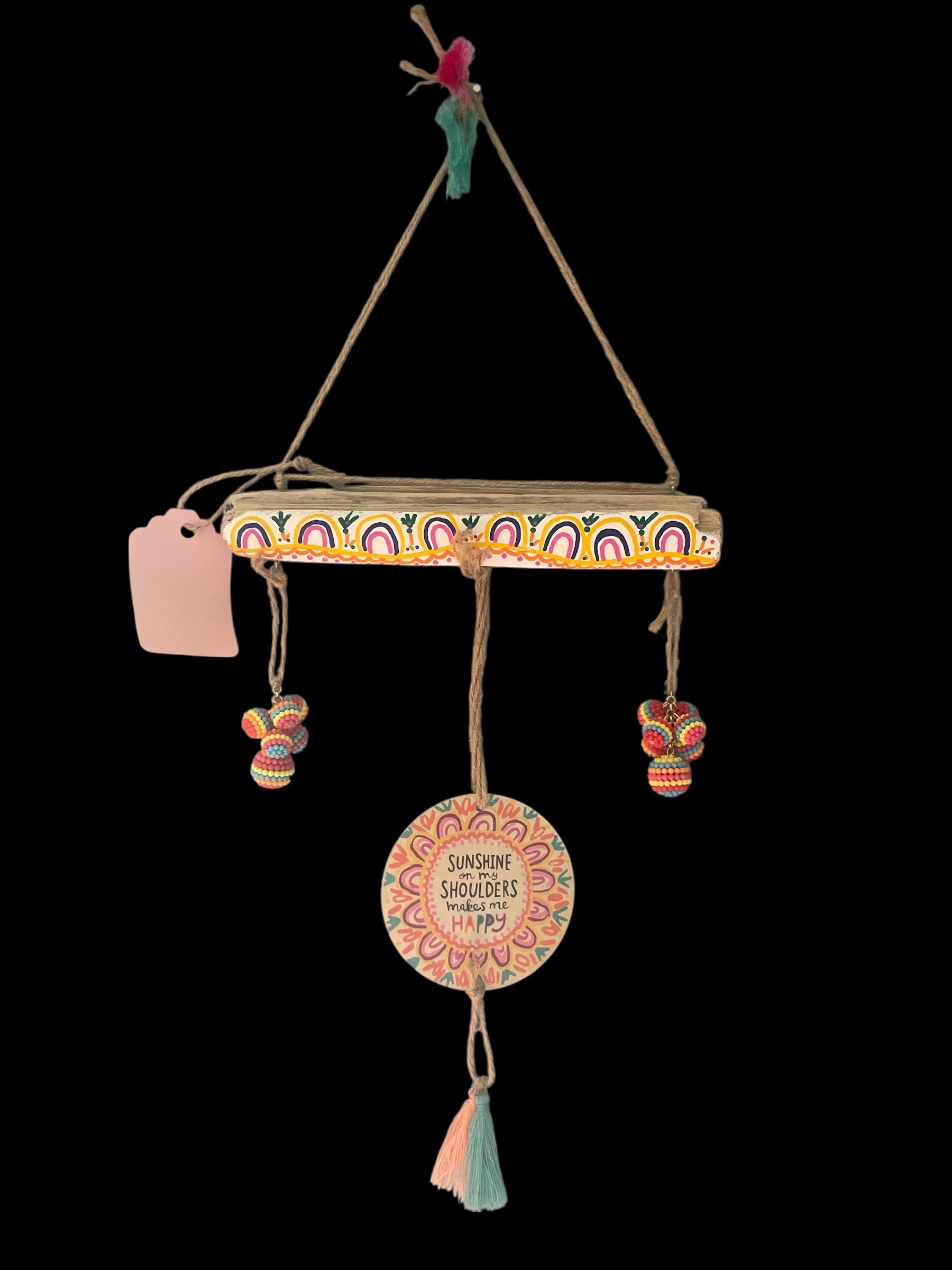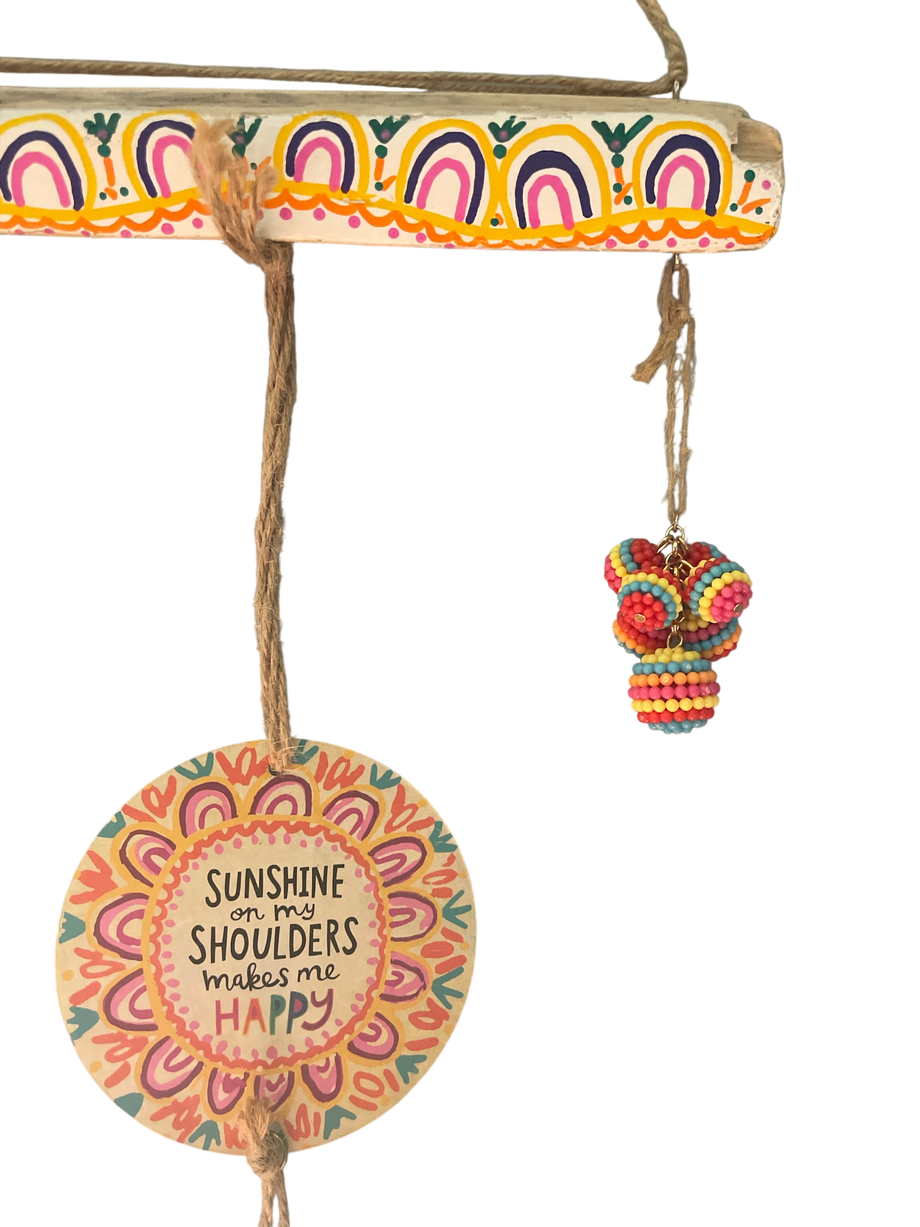 Lake Erie driftwood is hand-painted in the design of the main component, reminding us of that beloved John Denver song... Sunshine on My Shoulders. Beaded accents, tassels, and pure joy help this little piece bring positive vibes.