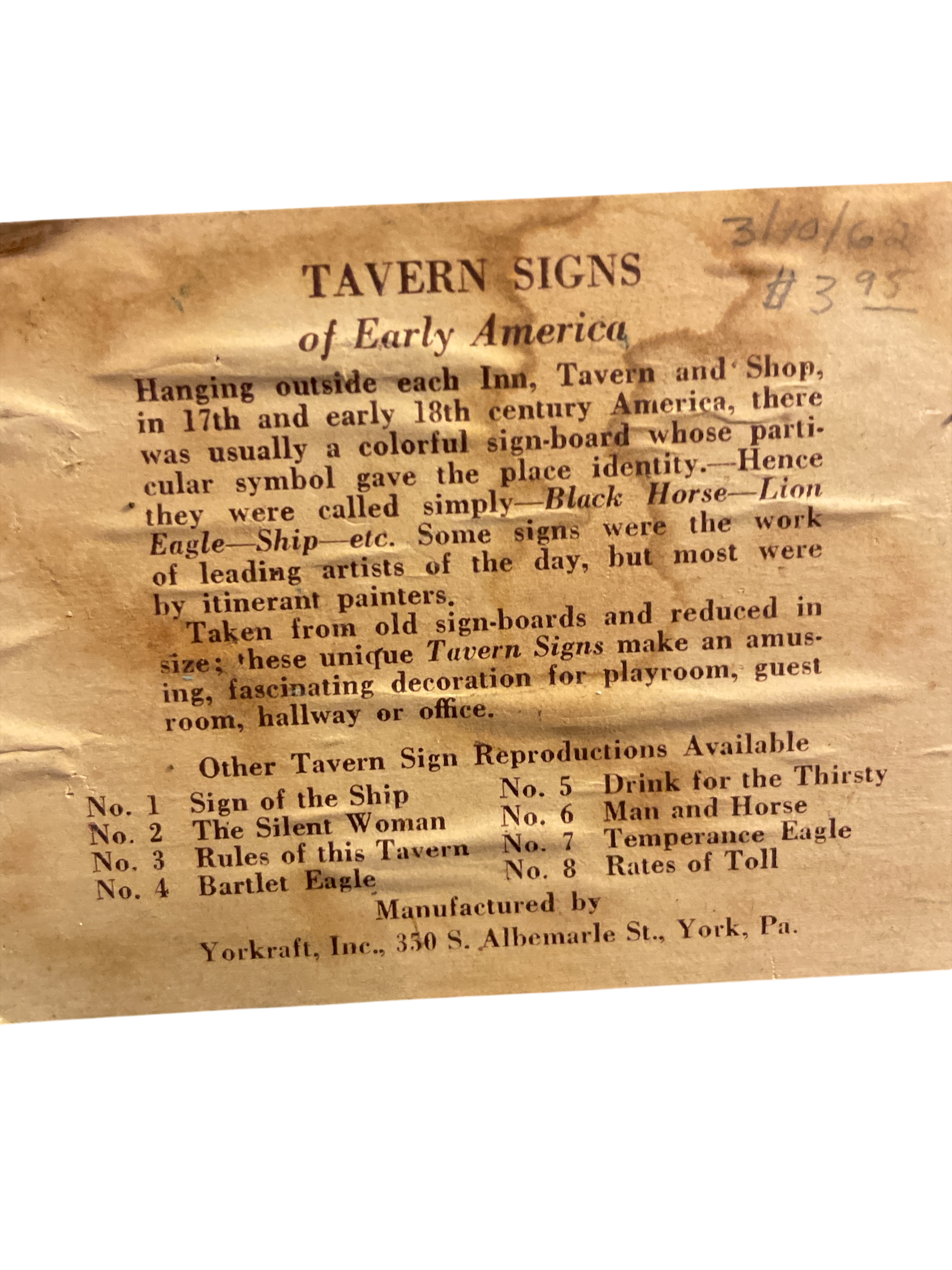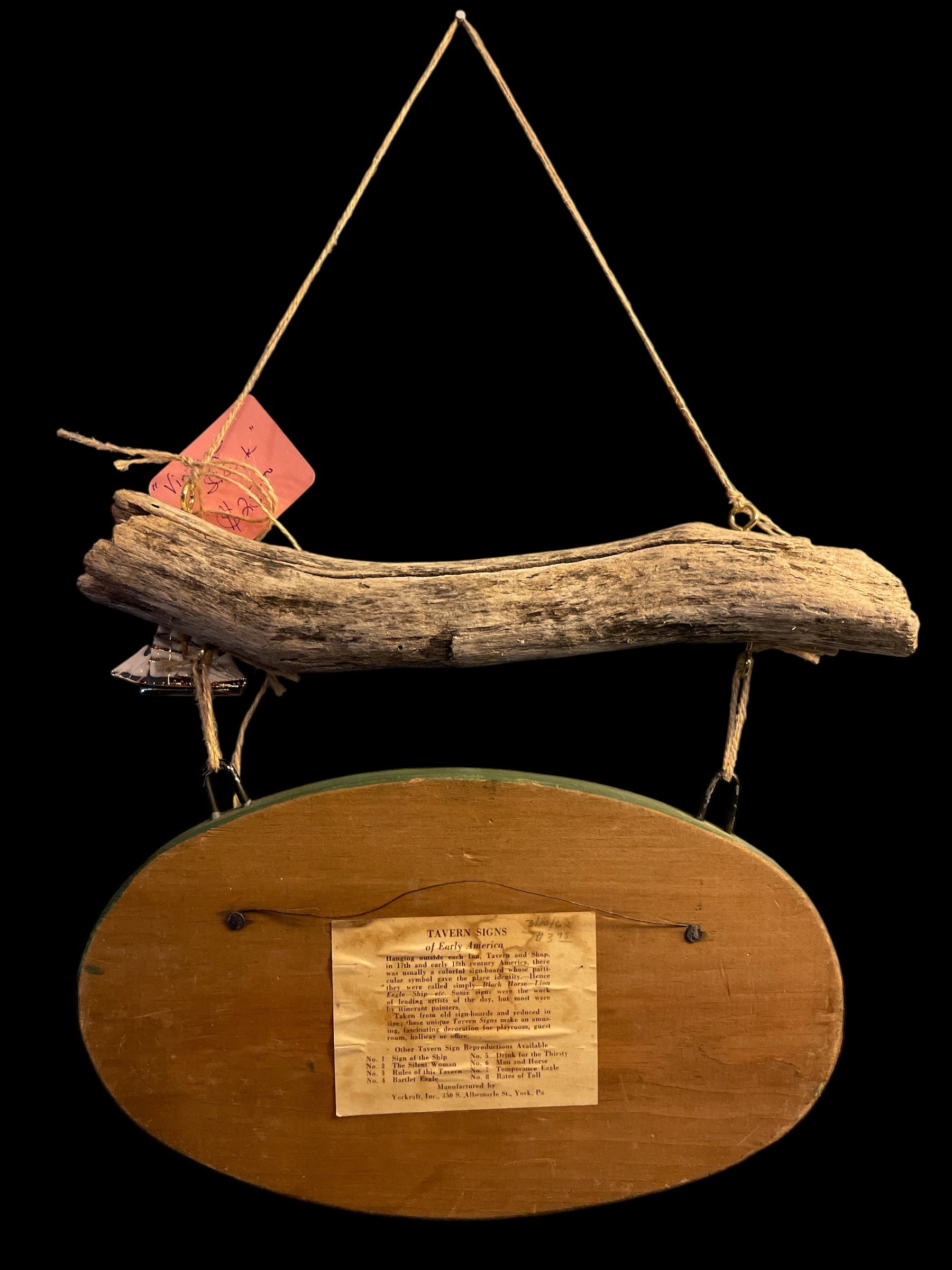A Tavern Sign of Early America, suspended from Lake Erie Driftwood and adorned with a tall ship pin. Classic and bold.