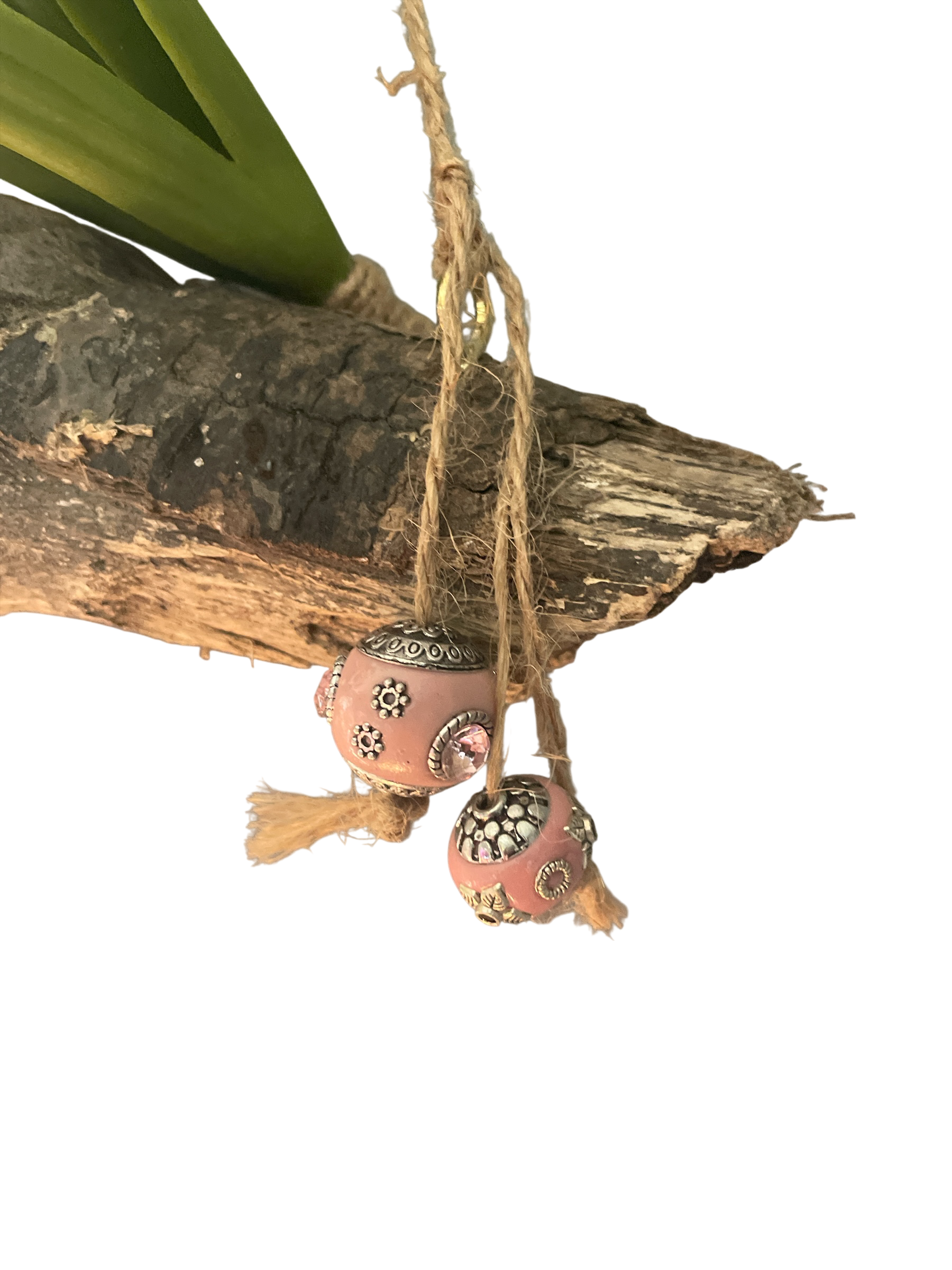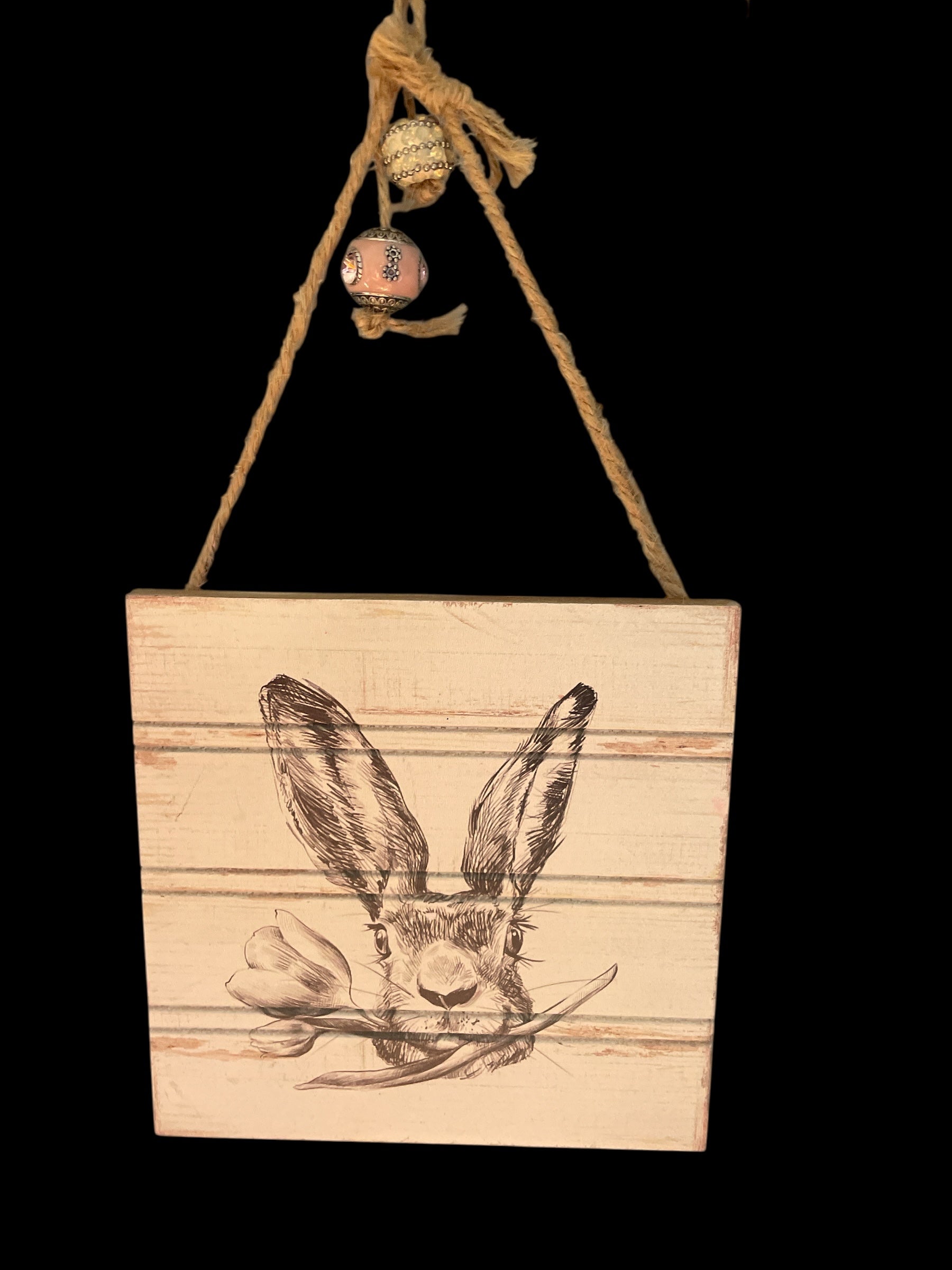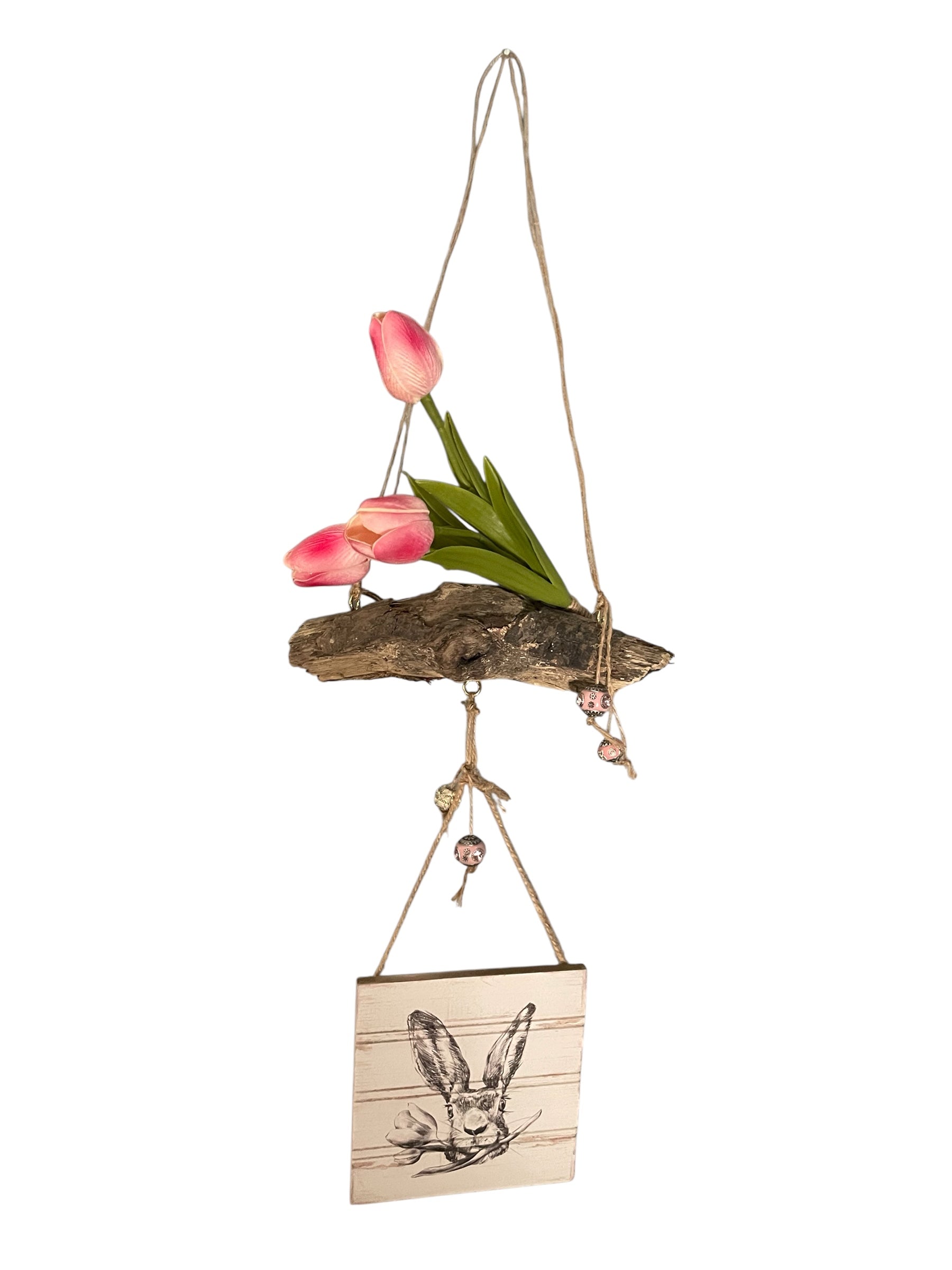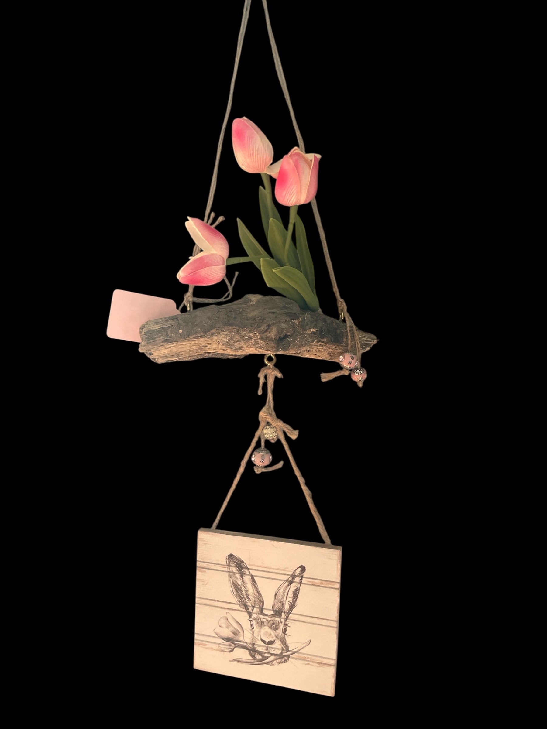 This piece definitely gives off Easter vibes. Pink faux tulips adorn a piece of Lake Erie driftwood. Unique beads add flair. The rabbit holds a tulip in his mouth, and, we can only imagine that the tulip is, in fact, pink.